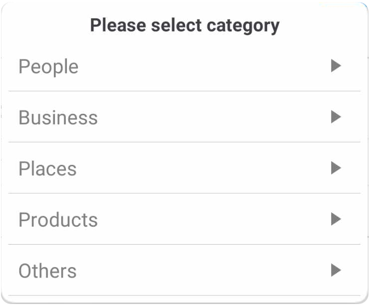- You can Select Category; click in the box & you will get a drop down list with the 5 main categories (People, Business, Places, Product & Others).